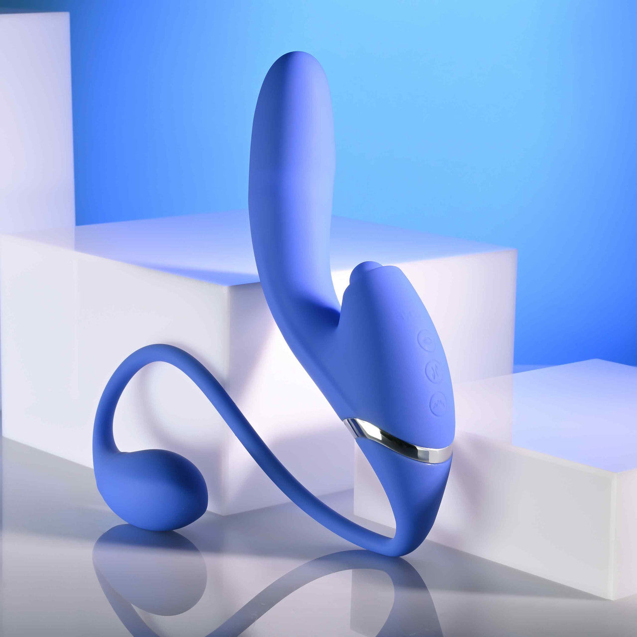 Go all in for pleasure! This unique toy features a gently curved, flexible, thrusting main shaft and a tapping stimulator that's designed to thumpity-thump in multi-speeds right where you want it most. Finally, a long flexible tail finishes with a plump, ergonomic vibrating plug to complete the rapturous experience. All 3 motors are controlled independently with their own buttons at the chunky center base that offers a relaxed grip.