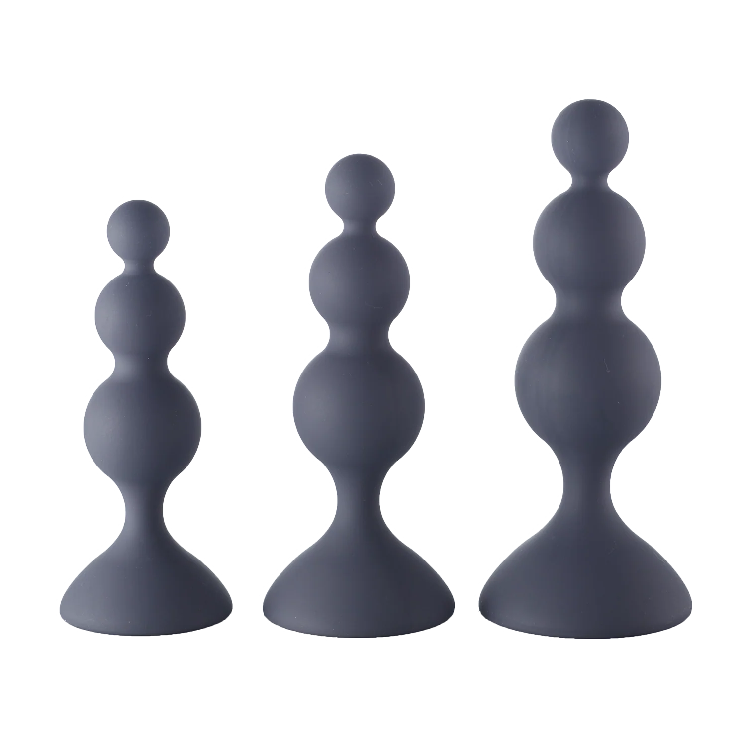 This backdoor training set features three graduated plugs to allow you to explore at your own pace. Each silky-smooth silicone plug has a beaded shape for comfortable insertion and includes a flexible shaft and flared base for safety and a suction-cup for hands-free exploration and play.