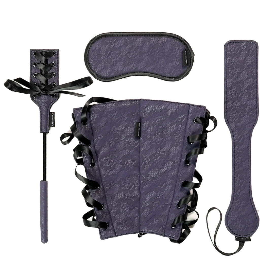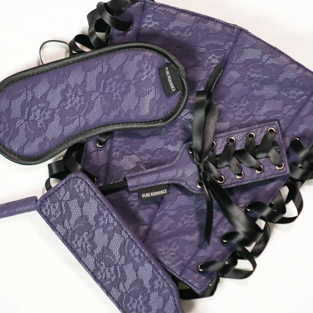 This four-piece bondage set features a satin-lined blindfold, forearm restraints, a sturdy paddle, and a teasing crop, offering nearly endless ways to explore control and submission. Designed with plush materials and elegant lace accents, it’s perfect for beginners and experienced players alike.