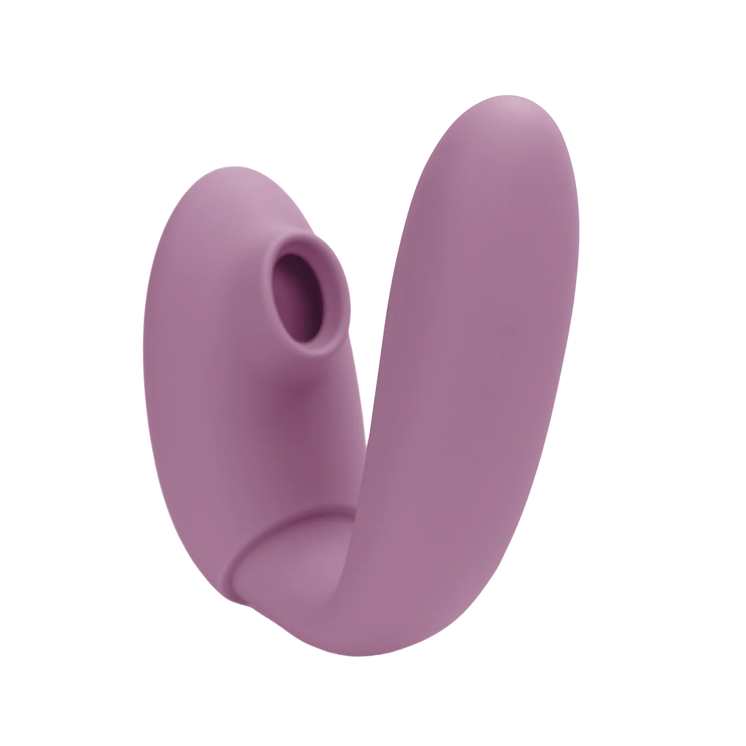 This air pulse vibrator features dual stimulation and a curved, hands-free design. The shaft boasts 7 speeds of vibration while the clitoral air massager offers up 5 modes of oral-like teasing. The removable sleeve turns the clitoral stimulator from air pressure to bumping massager for custom pleasure.